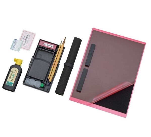 固形墨/ふで思いなぼくてき(180ml)/筆(太筆・細筆セット)/ぼくちすずり(5.3寸)/文鎮二本組/下敷/水差し/かんたん筆巻/半紙ばさみ/中皿左右両用/書道バッグ/書道のてびき/名前シール